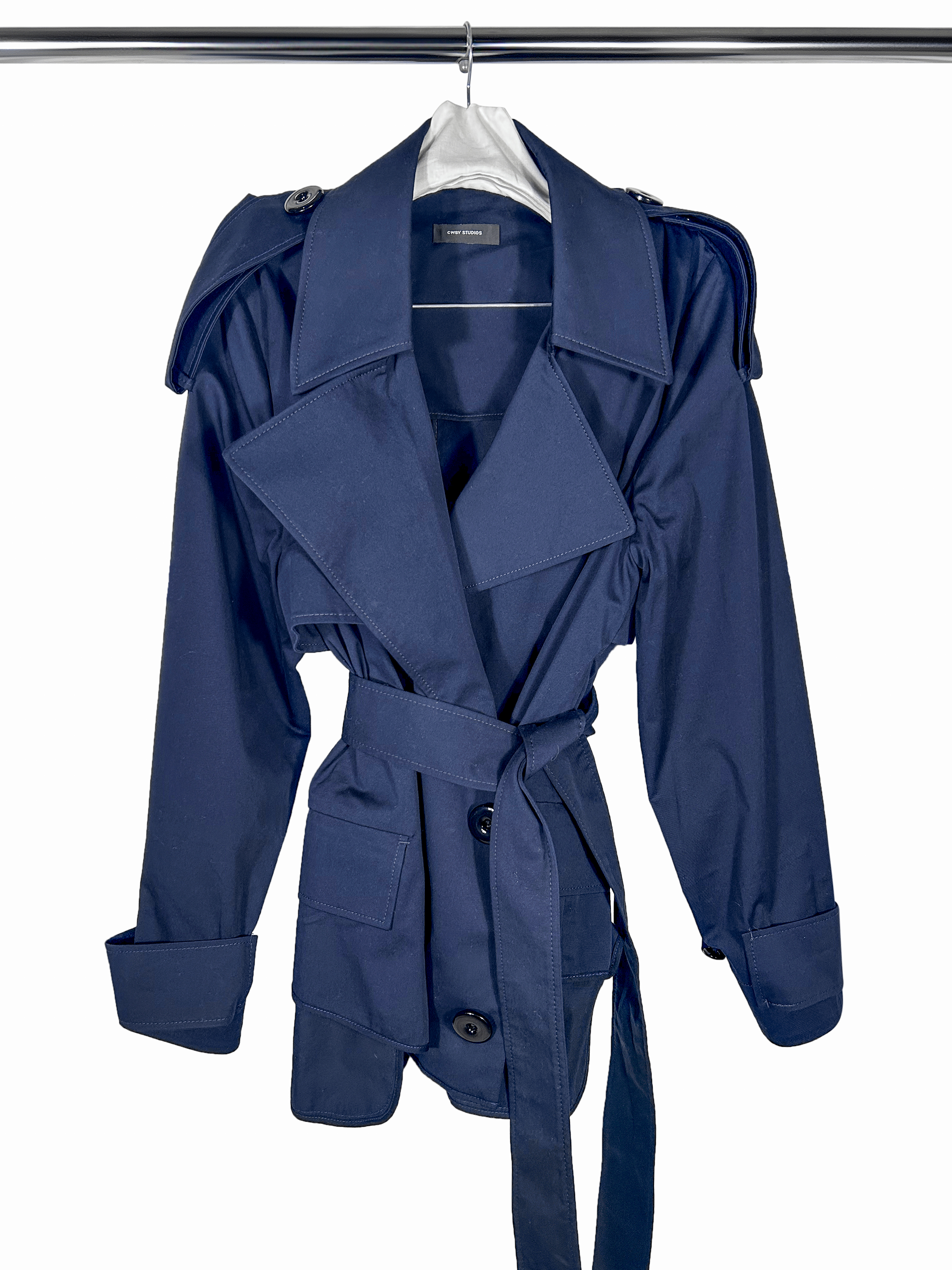 Upcycle reworked crop trench in navy blue is apart of CWBY STUDIOS Fall 25’ Collection. This garment is Hand sewn and made locally in Los Angeles.