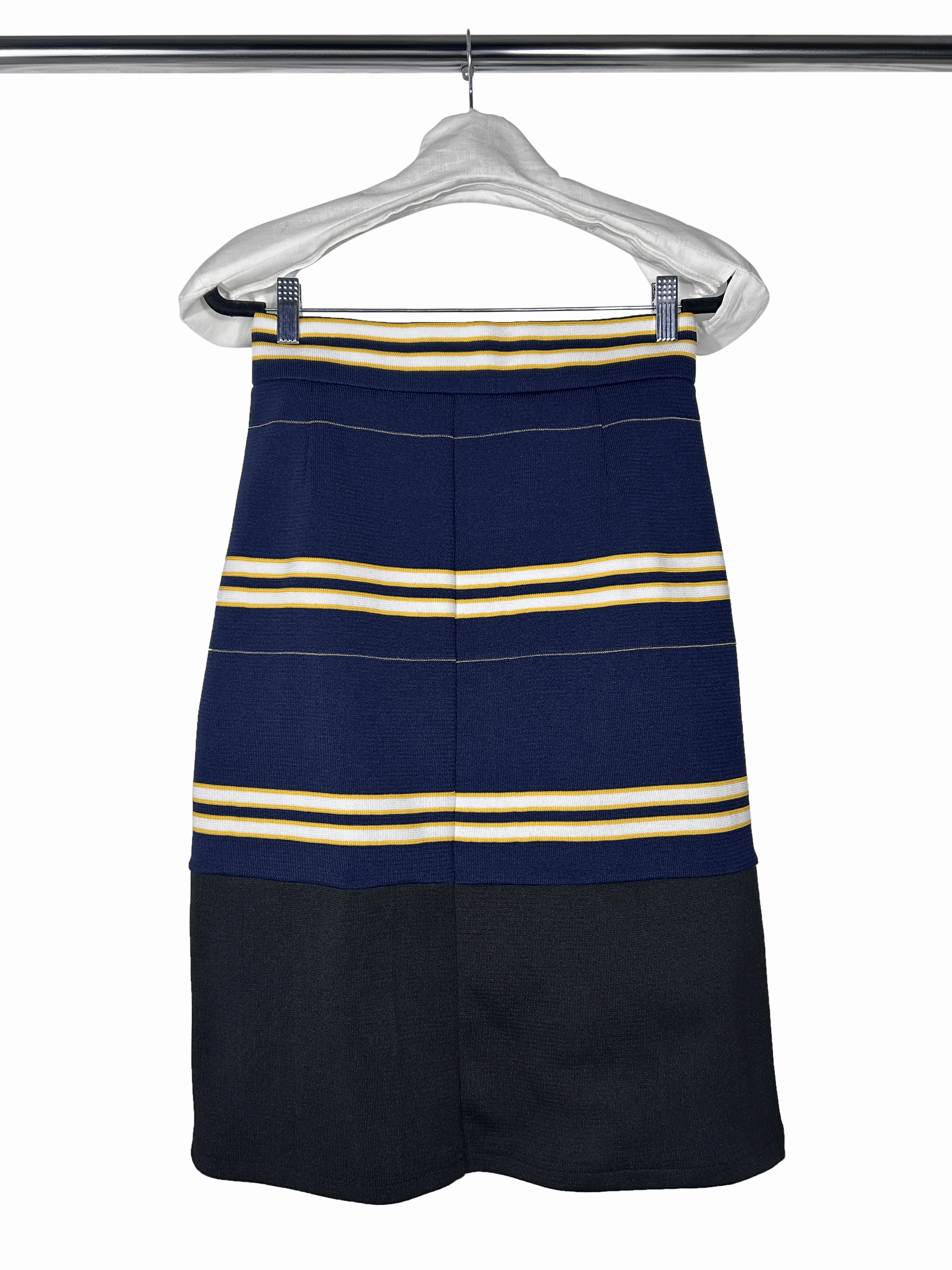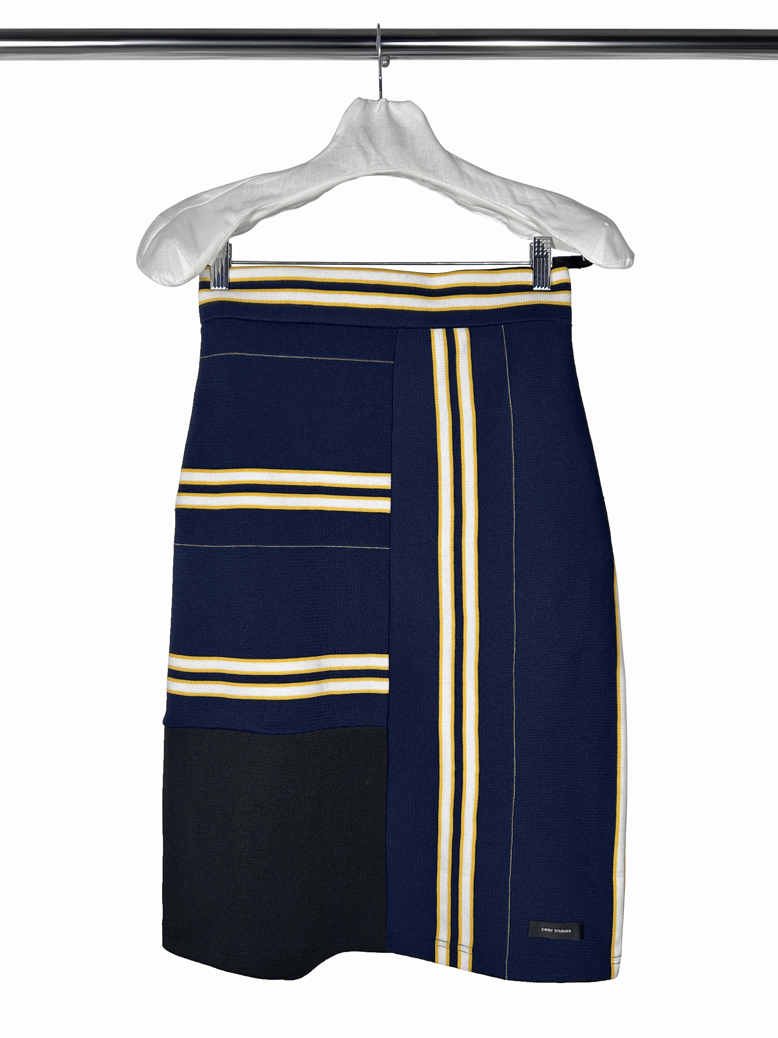 Rib stripe Jersey Skirt in Multi color Navy, White, Yellow, is apart of look 8 of CWBY STUDIOS FALL 25’ Collection. This hand sewn garment is tailored, and produced in Los Angeles.